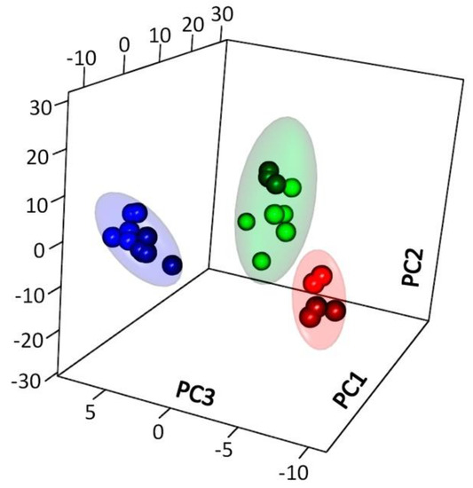 Application of the metabolite content as a means of accounting for proximity is not always the best form of measurement, since proximity may vary on account of the normalization method (by fresh weight, protein, etc.). Therefore, the metabolite content correlation was considered as a measure of proximity of metabolite profiles and then the dimension was reduced using MDS. In Figure S1b, the metabolite profiles are presented in the space of the first and third dimensions, the picture is similar to the one obtained using PCA.