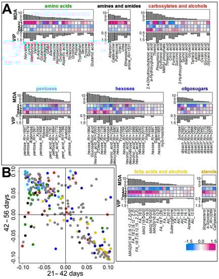 Analysis of age dependence of metabolite profile diversity. (A) Heatmaps of arbitrary normalized metabolite levels in pea cv. Finale roots during development of control plants sampled at days 21, 42, and 56. The top barplots are Mean Decrease Accuracy (MDA) obtained by the Random Forest, the bottom barplots are VIPs from PLS-DA. (B) SUS-plot: metabolite scattering in the space of loadings from OPLS-DA models for comparing roots of 21 and 42 day old plants (abscissa) and 42 and 56 day old (ordinate); positive values correspond to higher level at a later stage. Colors mirror chemical classes. Grey circles correspond to unidentified metabolites. “MAG”—monoacylglycerol; “FA”—fatty acid; “Alc”—fatty alcohol; “st”—sterol; RI—Kovatc retention index.