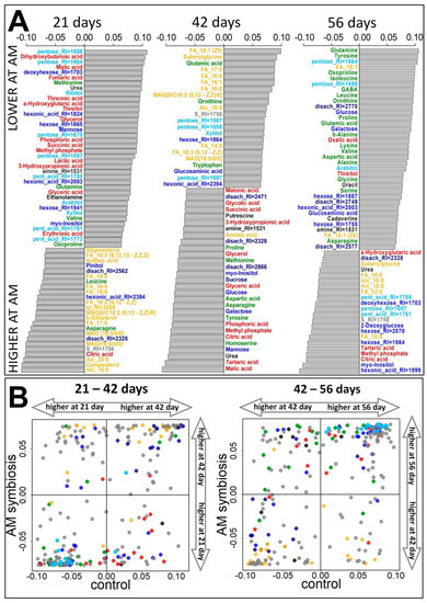 Influence of mycorrhiza on the metabolome of pea cv. Finale roots sampled at 21, 42, and 56 day. (A) Barplots of the loadings of predictive components (VIP > 1) from OPLS-DA models for comparison of control and mycorrhized roots, positive values correspond to a higher content during mycorrhization. (B) Influence of mycorrhiza on the metabolome dynamics. Metabolites scattering in the space of the loadings from OPLS-DA models for comparing adjacent time points under control (abscissa) and mycorrhization (ordinate). Color code is the same as in Figure 3.