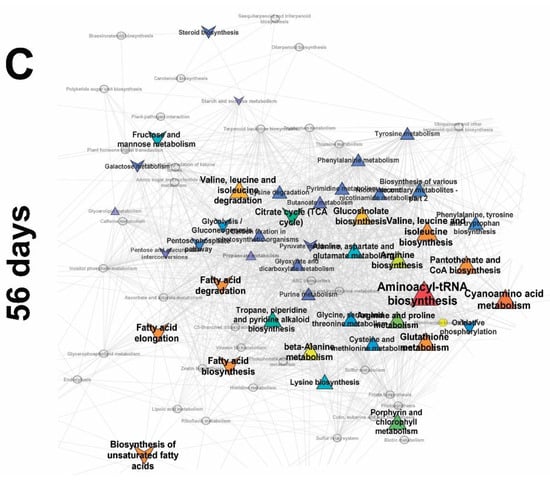 The model constructed using OPLS-DA showed that 33% of the variance in the content of metabolites (R2Y = 0.99, Q2Y = 0.94) was associated with a predictive component similar to the previous stages. The analysis of the loadings of the predictive component (Figure 4A) showed that positive values corresponding to a higher content under mycorrhizal conditions are inherent for many amino acids. Bidirectional changes in the content of fatty acids were observed depending on mycorrhizal infection. Saturated fatty acids and alcohols (12:0, 16:0, 18:0) had a higher content in the roots of control plants, and monounsaturated (18:1, 16:1) in mycorrhizal plants. It was noted that, at day 56, enrichment analysis showed a decrease in the pathways associated with the exchange of fatty acids in the presence of a symbiont (Figure 5). The differences in the sugar content were also multidirectional: major sugars such as glucose, galactose, and a number of unidentified monosaccharides (and their derivatives) were found in greater quantities in mycorrhizal plants. Control plants were characterized by higher content of a number of sugar acids and deoxyhexoses. In the absence of a symbiotic fungus, the root metabolome was characterized by a high content of carboxylates: citrate and tartrate.