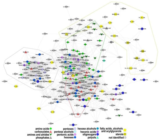 Mapping of metabolites by correlation of levels. Nodes correspond to metabolites, the shape and color reflect the chemical nature of the compound. Edges correspond to the strong Pearson correlations (r > 0.9) of the normalized average content in the variant (age-mycorrhization). Lines bound areas of related metabolites.