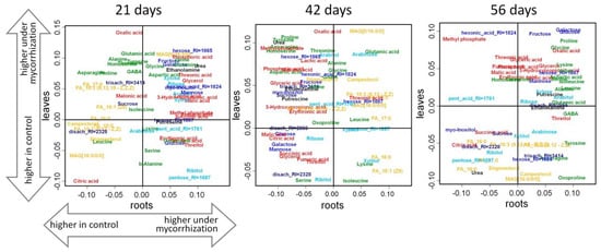 Comparison of the effect of mycorrhization on the roots and leaves of pea cv. Finale roots sampled at days 21, 42, and 56. SUS plots: scattering in the space of factor loadings of predictive components from OPLS-DA models for control and mycorrhized plant classification (abscissa—roots, ordinate—leaf), positive loadings correspond to higher content under mycorrhization. Color code is the same as in Figure 3.