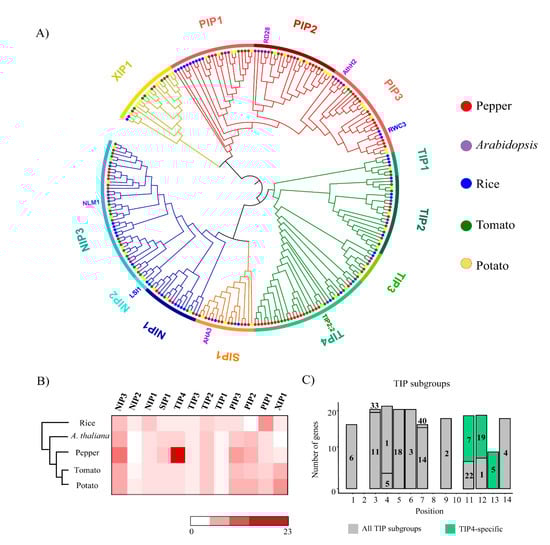 We next performed a phylogenetic analysis and determined the subgroups (of the subfamilies) to which the AQP genes belonged. The subfamilies PIP, TIP, and NIP were further separated into three, four, and three subgroups, respectively, whereas SIP and XIP remained as single groups (Figure 2A). Notably, a large number of AQP pepper genes in the TIP subfamily were mostly in the TIP4 subgroup—23 genes, representing 74% of the pepper genes in the TIP subfamily (Figure 2B). Examination of the motif composition of AQP domains in TIP subgroups revealed a set of specific motifs, 7, 9, and 15 on downstream regions, were only observed in pepper AQP domains of TIP4 (Figure 2C). These results are consistent with proliferation of specific TIP genes in pepper genome via lineage-specific duplication, which led to expansion of pepper TIP genes (Figure 2A).