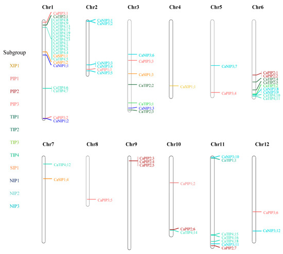 Location of AQP genes on chromosomes in the pepper genome. Colored gene names indicate the different subgroups.