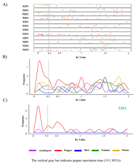 We next explored the duplication history of AQP genes. Gene duplication time was estimated by calculating the synonymous substitution rates (Ks) between recently duplicated gene pairs (Figure 4). Our analysis showed that the pepper AQP genes, especially those in the TIP4 subgroup, were actively duplicated, with a maximum Ks value of approximately 0.15. This also suggests that most of the duplication of the pepper AQP genes occurred after the divergence between pepper and other Solanum species, which have a Ks value of 0.3 [8] (Figure 4B,C). Taken together, these results indicate that recent gene duplications mainly occurred in TIP4 subgroup was a major contributor for construction of diversified AQP gene repertories in the pepper genome through expansion of specific AQP genes.