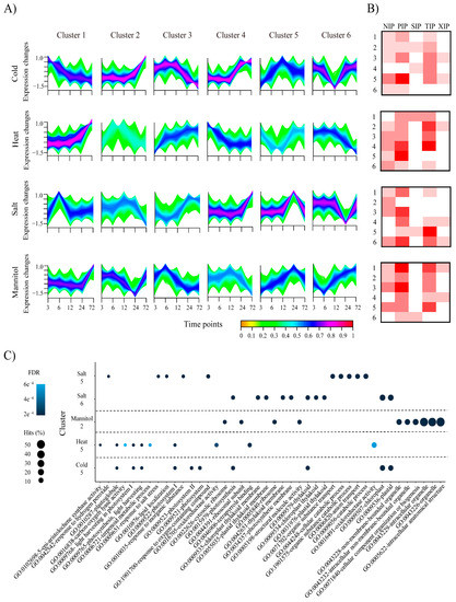Expression clustering and gene ontology (GO) enrichment analyses of differentially expressed genes (DEGs) in pepper. (A) Expression clustering analyses of pepper DEGs from plants exposed to different abiotic stresses are shown. The colored bar shows the membership grade with red indicating high association to each cluster and orange color indicates low association to each cluster. (B) Heatmaps showing numbers of pepper DEGs belonging to each AQP subfamily in plants exposed to different abiotic stresses. The heatmap values range from 0 to 6 genes. Y-axes present the cluster number in each abiotic condition. (C) Top 10 GO enrichment results of representative clusters containing AQP genes are shown as dot plots. Hits show the ratio of the number of genes with the corresponding GO-term to the total number of pepper genes. FDR, false discovery rate; PIP, plasma membrane intrinsic protein subfamily; TIP, tonoplast intrinsic protein subfamily; NIP, NOD26-like intrinsic protein subfamily; SIP, small basic intrinsic protein subfamily; XIP, uncategorized X intrinsic protein subfamily.