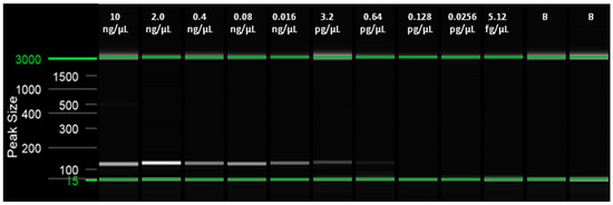Capillary electrophoresis using the QIAxcel Capillary Electrophoresis System (QIAgen, Valencia, CA, USA) of end point PCR carried out with the primers 14F/125R on serial 1:5 dilutions of WTB adult DNA.