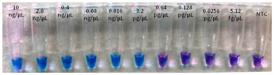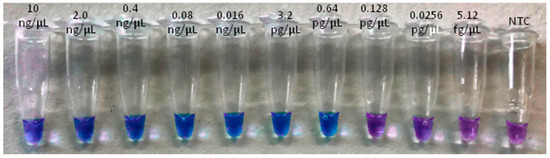 LoD assay of visual LAMP based on WTB adults using serial 1:5 dilutions (from 10 ng/µL to 5.12 fg/µL).