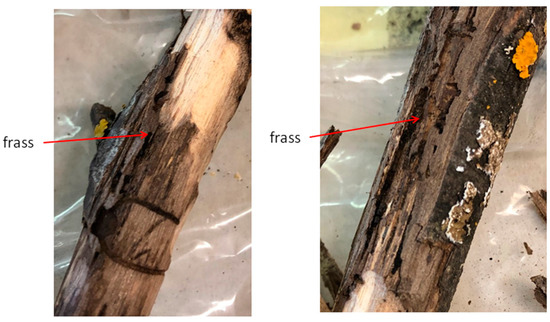Black walnut branches infested by P. juglandis with an indication (red arrows) of the frass sampling sites.