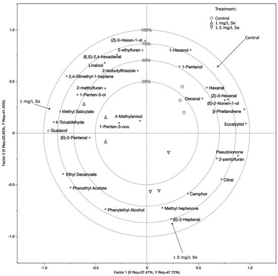 Data were processed by means of two-way ANOVA, using Statgraphics and considering the selenium concentration and time of its administration as variables. The results were then analyzed with the least significant difference (LSD) test (p < 0.05). Statistically significant values were indicated with different letters. VOCs were analyzed by partial least squares discriminant analysis (PLSDA) using JMP®, v. 16 (SAS Institute Inc., Cary, NC, USA).