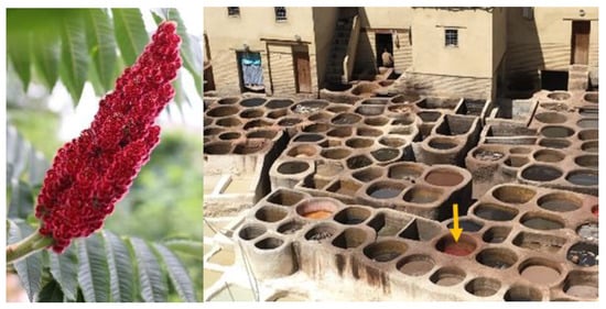 Sumac (Rhus coriaria L.) plant photo was taken in Marburg in July 2020 (left) and traditional tanneries of Fez Chouara in Morocco was taken in June 2019 (right).