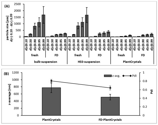 Lyophilization (freeze-drying (FD)) converted the produced PlantCrystals into bridle cakes, which were easy to redisperse in water. Upon redispersion of the PlantCrystals, a slight increase in the particle size was detected (Figure 4A). Hence, some of the PlantCrystals formed aggregates that were not fully redispersed. However, DLS data confirmed that the main size population possesses a particle size well below 1µm (Figure 4B). Redispersion of the lyophilized bulk and HSS suspensions led to smaller particle sizes. In brief, lyophilization redispersion of PlantCrystals formed some aggregates, but it decreased the particle size of the bulk and micronized HSS suspensions.