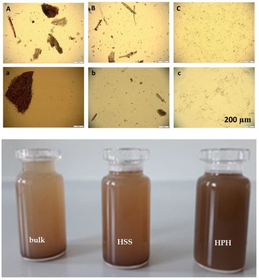 upper: Light microscopic images of sumac fresh suspensions (upper panel): (A) bulk-material and its (B) HSS-suspension and (C) PlantCrystals after HPH; sumac freeze dried (FD, lower panel) suspensions (a) FD-bulk-material and (b) FD-HSS-suspension (c) FD-PlantCrystals after redispersion (100-fold magnification and scale of 200 µm). Lower: Macroscopic images of the freshly produced suspensions of sumac, from left to right: bulk suspension, microsuspension after high speed stirring (HSS) and PlantCrystals after high pressure homogenization (HPH).