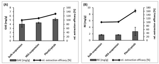 Determination of extraction efficacy, determined as total polyphenol content (A) and total flavonoid content (B) of sumac suspensions as bulk materials, micronized (HSS) and HPH-suspension (PlantCrystals). The polyphenol content is expressed in gallic acid equivalents (GAE), where gallic acid was used as benchmark reference. The flavonoid content is expressed as rutin equivalents (RE), where rutin was used as a as benchmark reference.