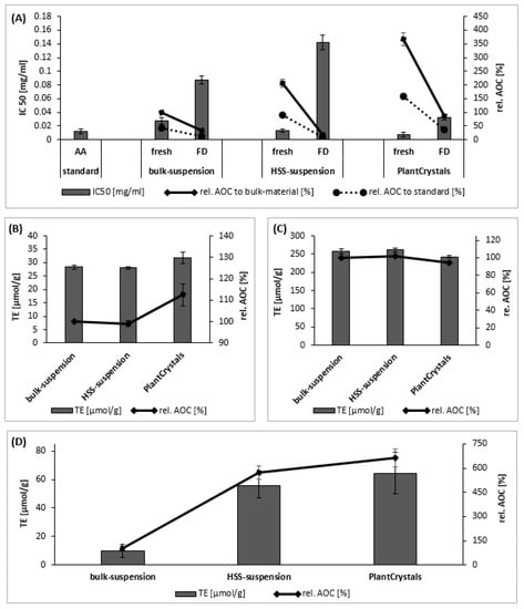 The rel. AOC represents the increase or decrease in AOC of plant samples when compared to ascorbic acid (standard) or the bulk suspension (Figure 7A). The fresh PlantCrystals from sumac fruits possessed a higher AOC than the ascorbic acid. The fresh bulk suspension possessed an AOC corresponding to about 40% of the AOC-value of the ascorbic acid. That was followed by an increase of about 90% and 160% for the fresh HSS and HPH sumac, respectively (Figure 7A). Interestingly, also the microsuspension (HSS-suspension) yielded such high AOC values. Additionally, the reason for the increased AOC values might be due to the destruction of plant cells, which causes an exhausting release of their active constituents. However, lyophilization redispersion process significantly increased the IC50 values, i.e., reduced the AOC of all the formulations produced in this study (i.e., bulk, HSS and HPH suspensions) (Figure 7A). Nonetheless, lyophilization redispersion, was an unavoidable step to store the formulations during the study period to perform the other assays, because otherwise the high water content would have caused microbial contamination and consequently destruction of the formulations during storage.