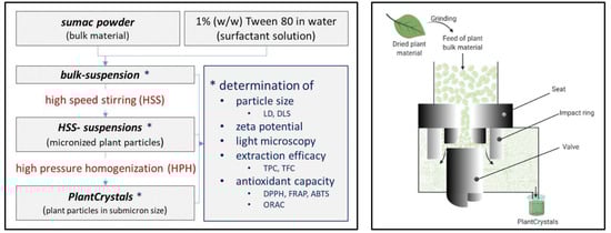 Sumac bulk material was further dry-grinded to obtain a fine powder by using mortar and pestle, a hand blender (Elta Lizenz GmbH, Oststeinbeck, Germany) and an AR1105 electrical grinder (Moulinex, Grenoble, France). In the next step, 1% (w/w) of the so obtained sumac bulk powder was suspended in a surfactant solution that contained 1% (w/w) Tween 80 as surfactant to obtain the sumac bulk suspension. The surfactant solution was used to physically stabilize the produced sumac particles and prevent their agglomeration. Subsequently, the bulk-suspension was premilled using high speed stirring (HSS) by a rotor-stator mixer (Ultra Turrax T25, IKA, Königswinter, Germany) employing different rotation speeds to obtain what was called a HSS or microsuspension. The microsuspension obtained was subjected to the nanomilling process using high-pressure homogenization (HPH) with a LAB 40 piston gap homogenizer in discontinuous mode with a batch size of 40 mL (GEA Soavi, Lübeck, Germany) at 1500 bar for up to 30 cycles to yield the PlantCrystals (Figure 8) []. A water bath was used to avoid the possible thermal damage of the sumac phytochemicals during HPH with a temperature set to 5 °C []. The suspensions obtained were immediately analyzed regarding size, zeta potential and antioxidant capacity. Subsequently, they were freeze-dried to enable long-time storage without microbiol degradation.