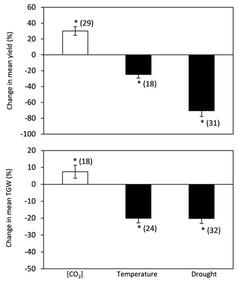 Change (%) in the mean of yield and TGW of plants grown under elevated [CO2], high temperature, and drought stress relative to the control. Data within parentheses indicate the number of observations. Error bars indicate the standard error of the mean. * indicates a statistically significant difference at p < 0.05.