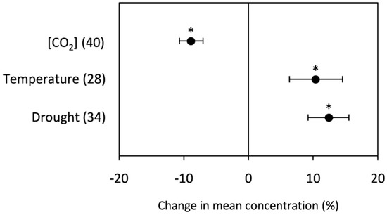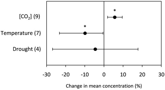 Change (%) in the mean concentration of grain starch of plants grown under elevated [CO2], high temperature, and drought stress relative to the control. Data within parentheses indicate the number of observations. Error bars indicate 95% CI. * indicates a statistically significant difference at p < 0.05.