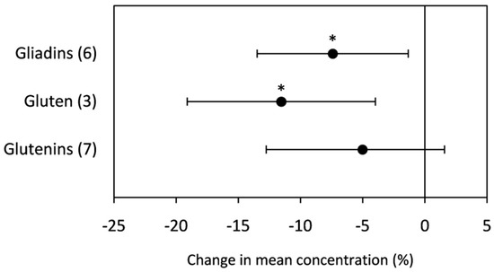 Change (%) in the mean concentration of grain gliadins, gluten, and glutenins of plants grown under elevated [CO2] relative to ambient level. Data within parentheses indicate the number of observations. Error bars indicate 95% CI. * indicates a statistically significant difference at p < 0.05.