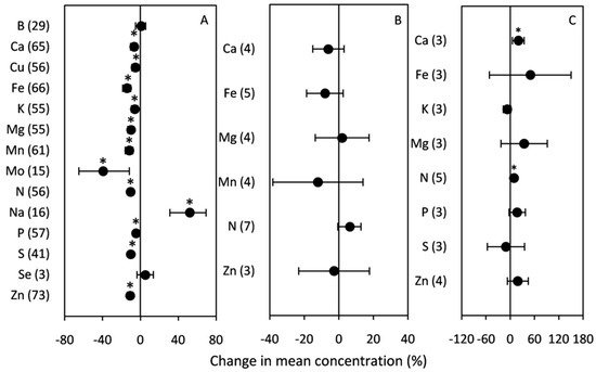 Change (%) in the mean concentration of grain minerals of plants grown under (A) elevated [CO2]; (B) high temperature; (C) drought stress relative to the control. Data within parenthesis indicate the number of observations. Error bars indicate 95% CI. * indicates statistically significant difference at p < 0.05.