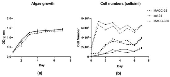 Growth parameters showing optical density and cell numbers of the algae strains grown under light/dark conditions over 7 days: (a) growth curve; (b) cell numbers. MACC-38 = Chlorella MACC-38; cc124 = C. reinhardtii cc124 and MACC-360 = Chlorella MACC-360 on both graphs.