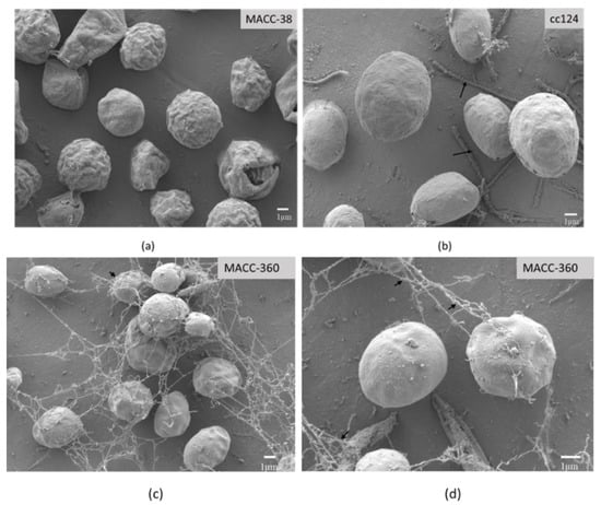 Scanning electron microscopy pictures of the three strains: (a) Chlorella MACC-38; (b) C. reinhardtii cc124; (c) Chlorella MACC-360 at 5000× magnification; (d) Chlorella MACC-360 at 10,000× magnification. Black arrows on (b) show flagella; black arrows on (c) show aggregation or clustering of cells while black arrows on (d) show the extracellular material connecting one cell to another in the cell aggregations/matrix.