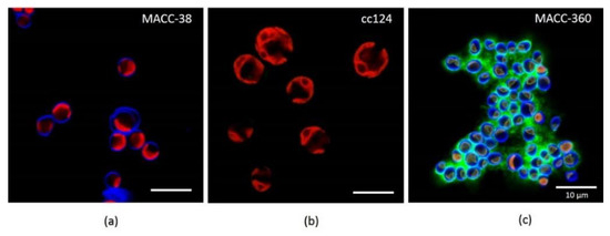 C. reinhardtii cc124 was not only larger in cell size than Chlorella species, but it was also different with respect to cell wall composition since CFW dye did not stain the Chlamydomonas cells. Chlorella species MACC-38 and MACC-360 had similar cell wall composition indicated by the blue fluorescence (Figure 3a,c, respectively). However, Chlorella MACC-38 was significantly larger in cell size than Chlorella MACC-360. In addition, MACC-38 did not form strong aggregates like Chlorella MACC-360 (Figure 3c).
