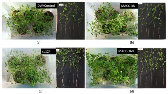 Overall, Chlorella MACC-360 and C. reinhardtii cc124 strains had a more striking effect on the M. truncatula than Chlorella MACC-38 (Figure 6).