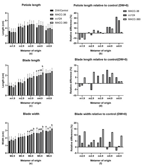All the strains reduced the petiole length of the first true leaf. The effects on the second and third leaves were negligible. In contrast, the MA increased leaf petiole length on the older leaves (M4.9 and M5.9). Chlorella MACC-38 and C. reinhardtii cc124 effects were stronger (12–32% increase) than those of 360 (2–9% increase). Overall, none of the strains significantly affected petiole length (Figure 5a,b).