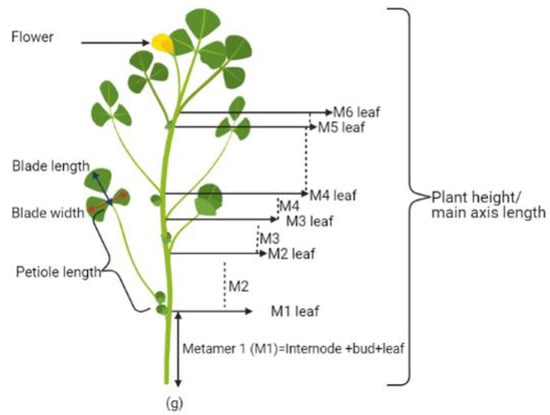 Algae application caused changes in the leaf dimensions of plants (Figure 5). The leaf dimensions measured were petiole length, leaf blade length and leaf blade width (Figure 5a–f). These were measured according to Figure 5g, following the numerical nomenclature coding of M. truncatula [69]. According to this nomenclature, metamers are labelled from the bottom to the top along the main axis as M1, M2, M3 and so on (Figure 5g). A metamer is the plant part including an internode, a bud and a leaf. The developmental stage of the plant parts is denoted with a decimal code from the bud stage to the fully open blue-green leaf that ranges between 0.1 to 0.9. In our study, we assessed measurements from 50-day-old plants. Consequently, all the leaves were fully matured at this time and hence the ‘0.9′ code on all measurements.
