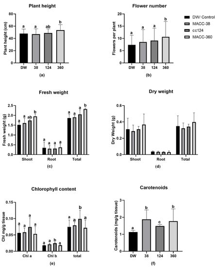 Effects of microalgae applications on plants (50-day-old plants); (a) plant height; (b) flower number; (c) fresh weight; (d) dry weight; (e) chlorophyll; (f) carotenoids. Data represent means and standard errors (error bars) of 10 biological replicates per experiment. Different letters on bars indicate significant differences between groups (p < 0.05), according to Tukey’s test. One-way ANOVA was used for all parameters.