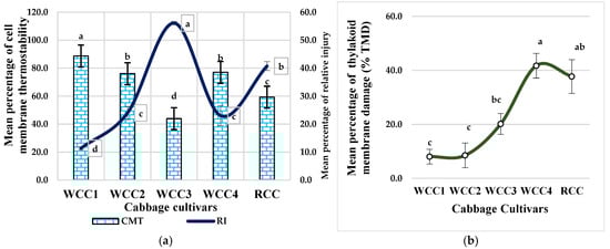 2.5. Effect of Heat Stress on Cell Membrane Thermostability (CMT) and Relative Thylakoid Damage in Brassica oleracea Cultivars