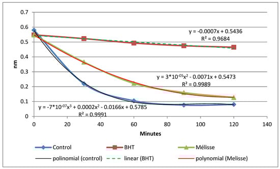 The decrease in lipid oxidation in this standard antioxidant (BHT) was according to the linear polynomial regression model (y = −0.0007x + 0.5436a), with R2 = 0.9684.