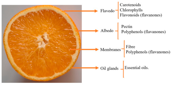 As mentioned above, these co-products are composed of two fractions, peel and pulp (seeds and membrane residues). The schematic view of the structural composition of citrus has been shown in Figure 1.