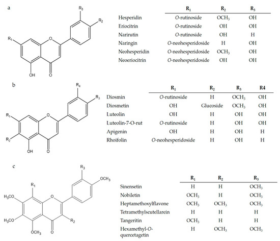 Flavonoids are present in most plants and constitute a very important class of bioactive compounds in citrus species; they are mostly found as glycosides, but they can also occur in free form (flavonoid aglycones) [44]. In addition, they can occur as sulphates, dimers, or polymers. Citrus glycosides can be found in two forms: as O-glycosides with the carbohydrates linked via oxygen atoms (hemiacetal bond), or as C-glycosides with the carbohydrates linked via carbon-carbon bonds. Of all these natural forms, O-glycosides are the most prevalent [45]. As mentioned above, flavanones (Figure 3a) and flavones (Figure 3b) are the main flavonoids found in the peel of citrus fruits. Within the group of flavones, receiving the generic name of polymethoxylated flavones (Figure 3c) is a chemical family of compounds that have a number of methoxyl groups equal to or greater than four. These compounds are also practically exclusive to citrus [50].