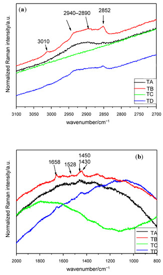 Raman spectra of seed endosperm in the interval (a) 3200–2700 cm−1 (λ = 633 nm), (b) 1650–150 cm−1 (λ = 633 nm). Treatments: TA: control, TB: magneto-primed seeds, TC: no magnetic treatment, soaked in water seeds, TD: magneto-primed and soaked in water seeds.