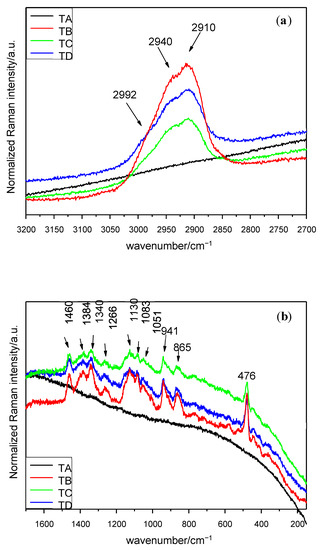 Finally, the spectra of the seed endosperm are similar for the 3 treatments (B–D), while the control is affected by fluorescence. In the 3200–2700 cm−1 interval, a doublet at 2940 and 2910 cm−1 and a shoulder at 2992 cm−1 (Figure 3a) can be observed. The spectrum which displays the greatest number of peaks in the experiment is by far the interval of 1650–150 cm−1 (Figure 3b) from this part of the seed. The full information is included in Table 3. Within the interval 1650–150 cm−1, two groups of peaks appear; the first one with almost 10 units is located between 1149 and 862 cm−1 (this means in less than 300 cm−1) and the other’s peak concentration is based around 1400 cm−1. The most intense peak is located at 476 cm−1.