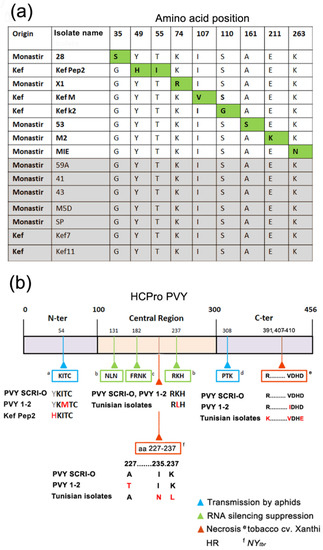 (a) Analysis of differences in the amino acid sequences encoded by the HCPro cistrons of the fifteen isolates of potato virus Y (PVY) from Tunisia. Their geographical origin (Monastir or El Kef) is indicated in first column. In the case of eight of the isolates, differences with the other isolates were limited to only one amino acid (isolates 28, X1, Kef M, Kef K2, 53, M2, MIE) or in one case, to two amino acids (isolate Kef Pep2), which appear highlighted in green. The HCPro amino acid sequences of seven of the isolates were identical to each other (highlighted in grey; isolates 59A, 41, 43, M5D, SP, Kef 7, Kef 11). (b) Schematic representation of the 456 amino acids of the HCPro protein, and of some published domains of relevance to its function in the aphid-mediated transmission of infection and in the suppression of antiviral silencing and how they relate to the sequences of the isolates used in this work: a [5]; b [28]; c [7,29]; d [30]; e [31]; f [32].