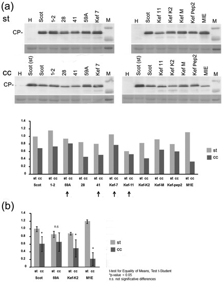 By Western blot, we also assessed the levels of viral CPs in the same systemic tissues in which we had measured genomic RNA levels by RT-qPCR in Figure 3. Densitometry analysis of the relative intensities of the CP bands showed that in all cases, CP levels were reduced in infected plants grown under cc vs. st conditions. However, reductions in CP titers were far less marked than those observed for the viral genomic RNAs, ranging from less than 20% (for isolate 59A) to a little over three-fold (isolate MIE) (Figure 4a). In the case of infections by isolate 59A, reductions in CP levels under cc vs. st conditions failed to be significant (Figure 4b).