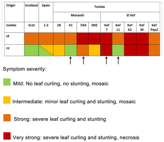 We also assessed the symptoms of infection induced in this experimental host by the isolates tested in plants kept under either controlled st or cc conditions. Symptoms at 10 dpi were classified into four categories according to their severity (Figure 5). Under st conditions, all the isolates tested induced either strong or very strong symptoms, with severe leaf curling and stunting, and in some cases, also the appearance of necrosis (Figure 5). However, we observed isolate-specific differences with regard to the symptoms when considering both st and cc conditions (Figure 5). The Scottish and Spanish isolates, as well as some of the Tunisian isolates, induced mild symptoms under cc conditions, while other Tunisian isolates induced strong or very strong symptoms under cc conditions. Interestingly, these differences occurred despite very high similarities among the HCPros expressed by the Tunisian isolates. In fact, four Tunisian isolates expressing identical HCPros displayed different symptom categories (Figure 5; isolates 41, 59A, Kef 7 and Kef 11, indicated by arrows). Therefore, even though some Tunisian isolates encoded identical HCPro proteins, the symptoms they induced under cc conditions were different.