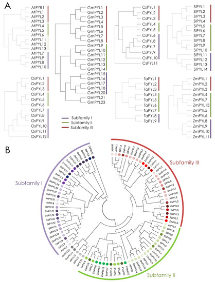 ABA receptors in different crops. Cladograms (A) and circular phylogenetic tree (B) of PYR/PYLs in eudicot and monocot food crops. Receptors are grouped in three different subfamilies: subfamily I (purple), subfamily II (green) and subfamily III (red). Cladograms and the circular phylogenetic tree were built with the maximum likelihood method. The phylogenetic tree was built using 1000 bootstraps in MEGA. Numbers indicate bootstrap values.