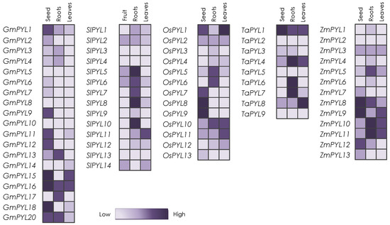 Gene expression of the ABA receptors in different crops. The expression levels of the different genes are represented with increasing purple intensities as indicated in the legend. Expression data were extracted from the references indicated in the text [39,41,42,45,46,49,74].
