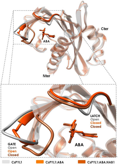 Conformational states of a crop ABA receptor. Superimposition of the CsPYL1 crystal structures corresponding to the apo (PDB ID: 5MMQ), ABA-bound (PDB ID: 5MMX) and ternary complex (PDB ID: 5MN0) forms. The highly conserved latch and gate are highlighted in solid colors.