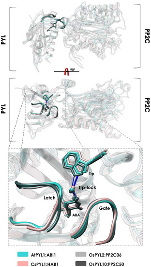 Arabidopsis and crop ABA-receptors adopt a similar latch-closed/gate-closed conformation upon PP2C binding. Structural alignment of PYL:ABA:PP2C ternary complexes from Arabidopsis thaliana (PDB ID: 3KDJ), Citrus sinensis (PDB ID: 5MN0) and Oryza sativa (PDB ID: 4OIC and 5GWP). The bottom panel shows a zoomed-in view of the PP2C tryptophan-lock highlighted in solid colors, similar to the gate and the latch loops.
