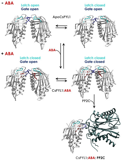 Recent structural studies, performed in crops (citrus and tomato), have identified a latch-closed/gate-open ABA-bound intermediate, which may be unable to interact functionally with the PP2C (Figure 3 and Figure 5A) [31]. This intermediate has not been found in any Arabidopsis PYR/PYL structure. In addition, the asymmetric unit of the ABA-bound PYR1 crystal structure from the turfgrass Festuca elata contains three ABA-bound monomers forming a crystallographic trimer, in which two monomers are adopting the latch-closed/gate-open intermediate described in citrus and tomato (Figure 5) [77]. Strikingly, the third monomer is adopting the latch-closed/gate-closed conformation (able to interact with PP2C), suggesting the existence of a conformational equilibrium between the latch-closed/gate-open and the latch-closed/gate-closed conformations of ABA-bound receptors. Thus, either the Arabidopsis intermediate is recalcitrant to crystallization, or the mechanism inferred from Arabidopsis crystal structures is slightly different in other plants. In any case, the identification of this intermediate would complement the mechanism deduced from Arabidopsis structures. Taking into account this intermediate, the updated conformational mechanism of ABA perception would be as follows (Figure 6): (1) The apo forms of PYR/PYL proteins are in a conformational equilibrium between a form with the latch and the gate in an open conformation and another form with the latch closed. (2) Then, ABA selects the latch-closed/gate-open conformation and the equilibrium is shifted to another equilibrium between the ABA-bound receptor latch-closed/gate-open and latch-closed/gate-closed forms (Figure 6). (3) The latch-closed/gate-closed ABA-bound conformation of the receptor is selected by the PP2Cs forming the functional ternary complex, which in turn may shift the equilibrium of the ABA-bound receptor forms to the gate-closed/latch-closed form. This strongly suggests that the presence of the PP2C promotes the adoption of the latch-closed/gate-closed PYR/PYL conformation able to interact with the phosphatase, supporting that clade A PP2Cs may be considered as ABA co-receptors [31,82]. Crystal structures of the ternary complexes from the monocot crop Oryza sativa also support this model. In the ternary complexes formed by OsPYL2 and OsPYL10, with the phosphatases OsPP2C06 and OsPP2C50, respectively, the receptors are adopting the latch-closed/gate-closed conformation as described in Arabidopsis, citrus and tomato (Figure 4) [44,76]. Hence, from all these data, it is clear that the mechanism of ABA-binding and the consequent formation of the ternary complex with PP2Cs are conserved among crop plants including mono- and eudicotyledons.