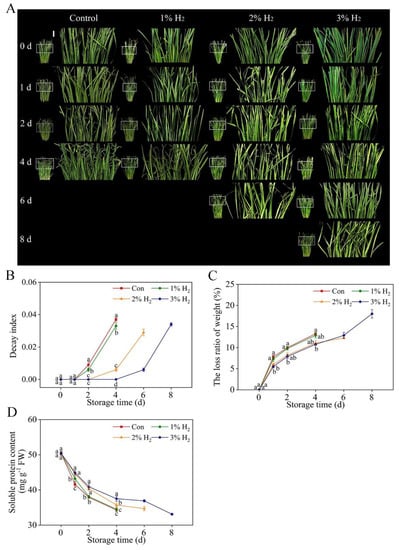 Effects of molecular hydrogen on shelf life of Chinese chive (A), decay index (B), the loss ratio of weight (C), and soluble protein content (D). Chinese chive was kept in air (control), 1% H2, 2% H2, and 3% H2 during storage at 4 ± 1 °C. Error bars represent the standard error (SE; n = 15 for decay index, n = 15 for the loss ratio of weight, n = 5 for soluble protein content). Bars with different letters for each storage time are significantly different (p < 0.05) according to Duncan’s multiple tests. Scale bar = 1 cm.