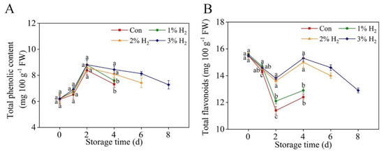 Time-dependent changes of total phenolic (A) and flavonoid (B) contents in response to molecular hydrogen. Chinese chive was stored at 4 ± 1 °C. Meanwhile, related parameters were analyzed. Means ± SE (n = 3 for phenolic and flavonoid contents, respectively) followed by different letters for each storage time indicate a statistical difference at p < 0.05.