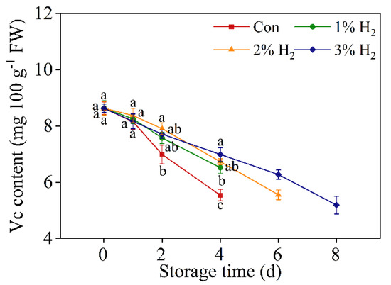 Time-dependent changes of vitamin C contents in response to molecular hydrogen. Chinese chive was stored at 4 ± 1 °C. Means ± SE (n = 3) followed by different letters for each storage time indicate a statistical difference at p < 0.05.