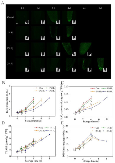 Subsequently, we found that H2 improved the preservation ability of Chinese chive by reestablishing redox homeostasis. It is well known that during storage, the occurrence of redox imbalance, caused by the accumulation of ROS, is one of the most important factors accelerating senescence during the storage of vegetables and fruits [33]. Normally, ROS accumulation is characterized by fast superoxide anion radical productive rate and therefore more H2O2 content, thus resulting in membrane lipid peroxidation [34,35], which is expressed as TBARS content. In our experiments, the accumulation of ROS and H2O2, and thereafter lipid peroxidation in leaves of chives were less pronounced in the presence of 3% H2, especially under the similar time points, compared with the control group (Figure 4A–D), indicating that H2 reduced the damage of excessive ROS in chives. Above results might be explained by changes in DPPH scavenging activity conferred by molecular hydrogen (Figure 4E). Redox homeostasis was therefore reestablished to some extent.