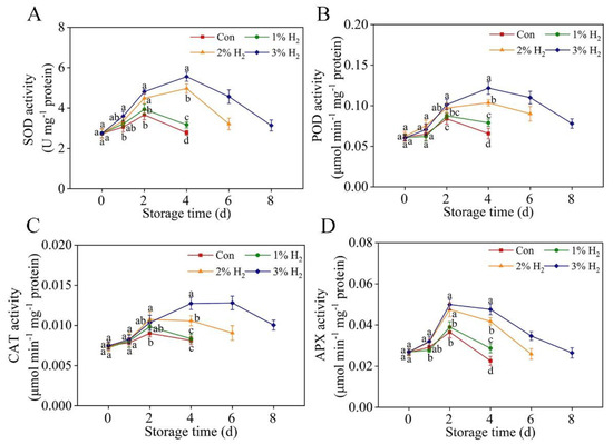 Next, to investigate whether the alleviation of oxidative damage during the storage period was causally caused by the increased antioxidant defense, activities of representative antioxidant enzymes, including SOD, POD, CAT, and ascorbate peroxidase (APX), were determined. Results shown in Figure 5 reveal that during 4 days of storage time, activities of the above four antioxidant enzymes in control sample displayed increasing tendencies (until 2 days), followed by decreasing during the rest of the storage period. Similar tendencies were observed in 1% H2-treated group. By contrast, total activities of these enzymes were intensified until 4 days (SOD, POD, and CAT) or 2 days (APX) of storage periods, and slowed down thereafter until 8 days in other H2 groups, and these effects were maximal in the presence of 3% H2.